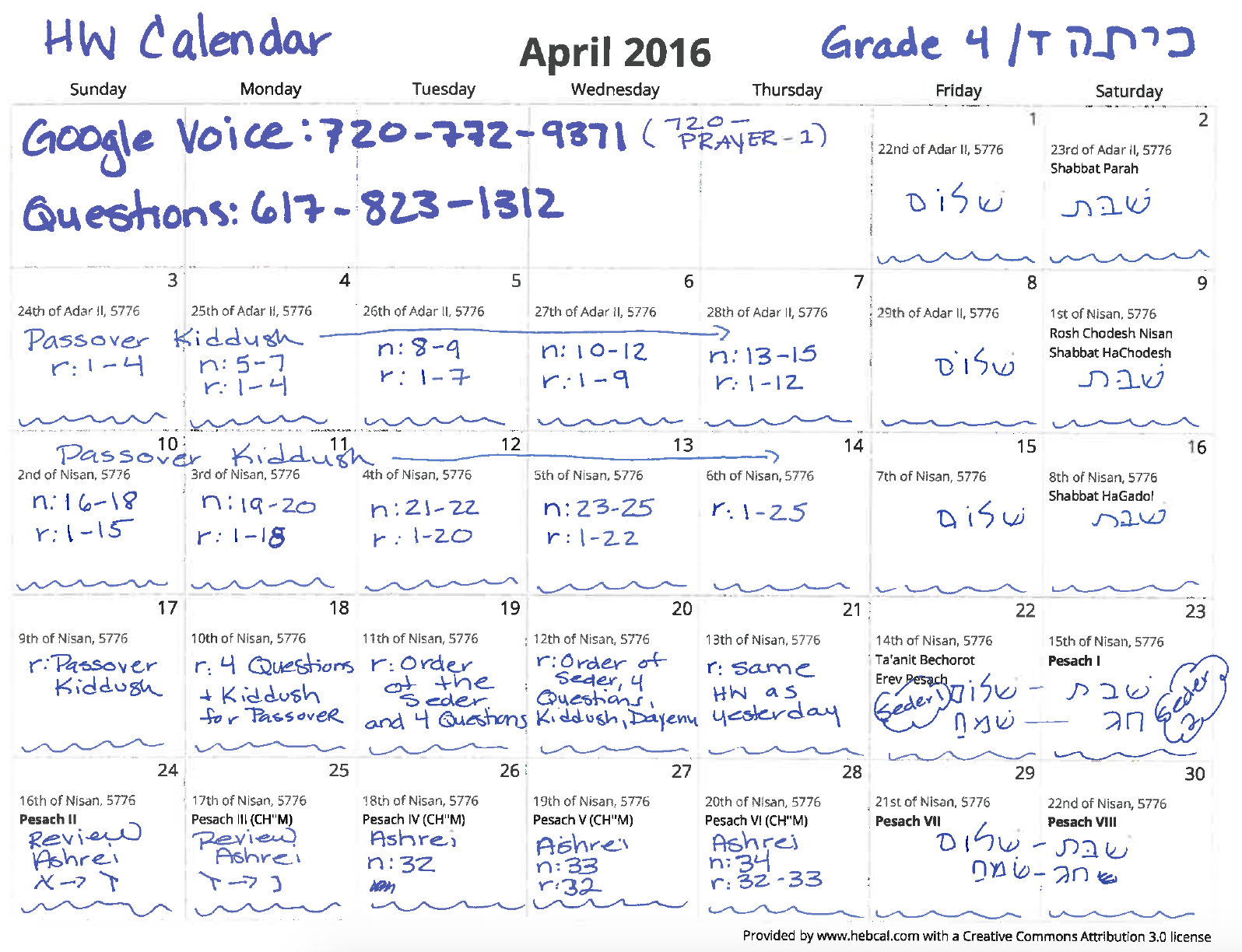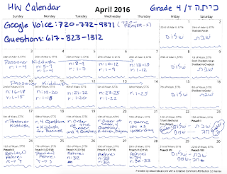 Please find below the Passover Kiddush and an April HW calendar. The kids did a great job with Kedusha – it is long with difficult words. If your child is still working on it, they may continue at their own pace. The week before Passover, I have listed suggested “things” from the seder for kids to review in preparation for the seder, but anything you decide they should work on is acceptable. As long as they practice something in Hebrew that week you can sign their calendar.
