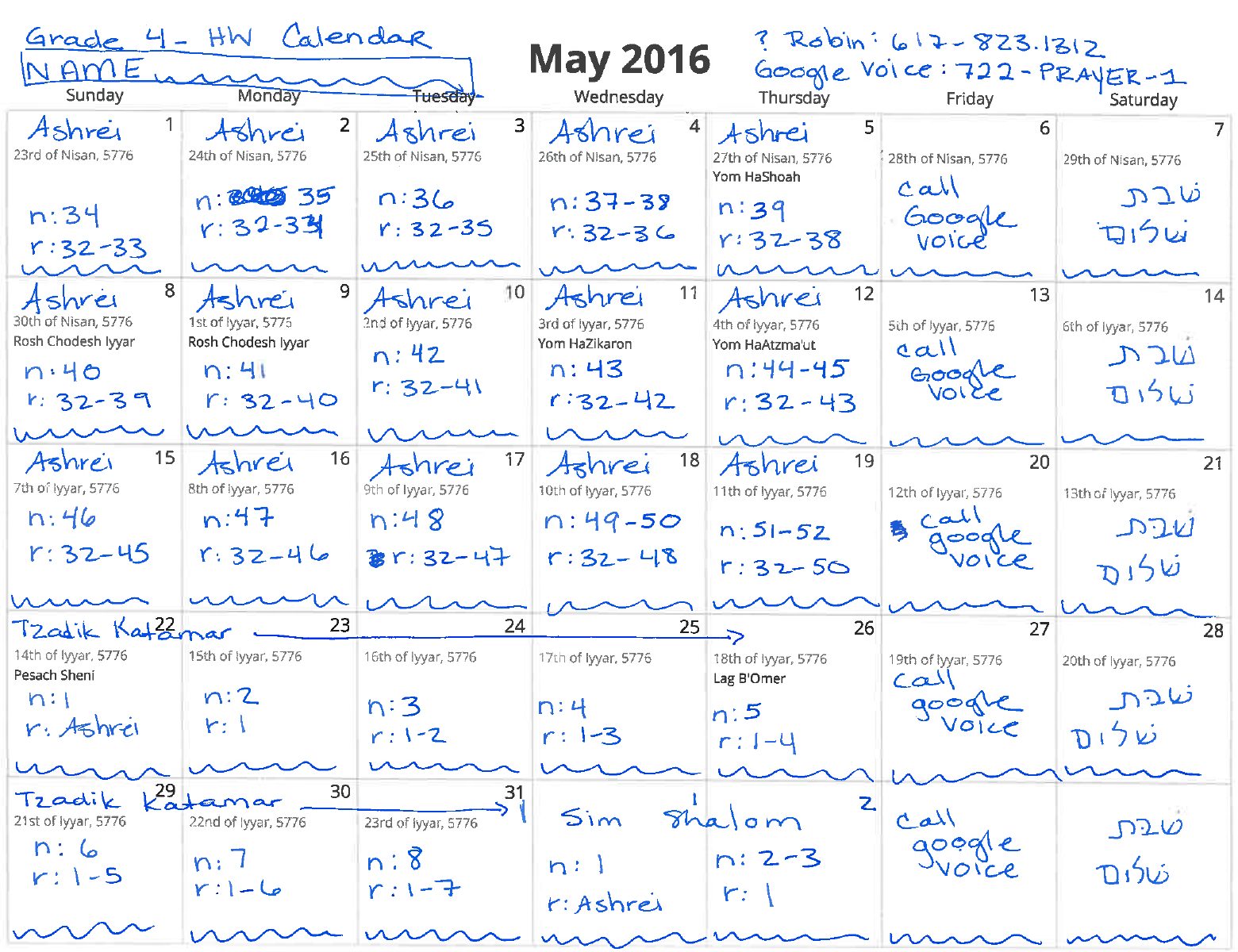This morning the 4th graders got their May homework calendar. In May we’ll be working on the final lines of Ashrei as well as the song Tzadik Katamar. This line comes from a Psalm sung on Friday night and the words are frequently danced to in Israeli folk dance. Later this month we’ll spend some time with Rabbi Dan dancing to these words! Students also worked with Joanne on a lesson about Shavuot and talked about Shavuot different meanings. They learned that Shavuot is a very important holiday – so much so we count the days between Passover and Shavuot: 49 days! Shavuot is celebrated on the 50th day! See you all soon!