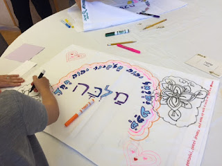 Our main activity this morning was the Shema Family Program. Jacqueline Serebrani-Kesner led us in exploring what we do at bedtime and why the prayer is important. Then students decorated a pillow inscribed with the words of the shema. Using their Hebrew name cards, the children wrote their Hebrew names on the pillowcases and decorated them.