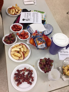 SPECIAL EVENT: Cheryl and I read parts of a seder for the children. After the brachot, we drank four cups of juice—white for winter, add a little “pink” for spring, add more pink for summer. The final cup is all red for the rich colors of fall. We tasted different kinds of food, accompanied by the bracha for fruit of the tree. The first fruit is one which you peel—clementines. The second fruit has a pit that you cannot eat. Because of the season and allergies, we substituted apples. For entirely edible fruit, we ate strawberries and seedless grapes.