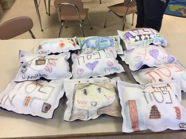 CRAFT: Using felt pieces and fabric markers, we decorated a Seder pillow (we recline as free people). We stuffed it with hypoallergenic poly fill. I sewed around most of it, leaving a long thread to be completed at home, if you wish. I stapled the pillows shut.