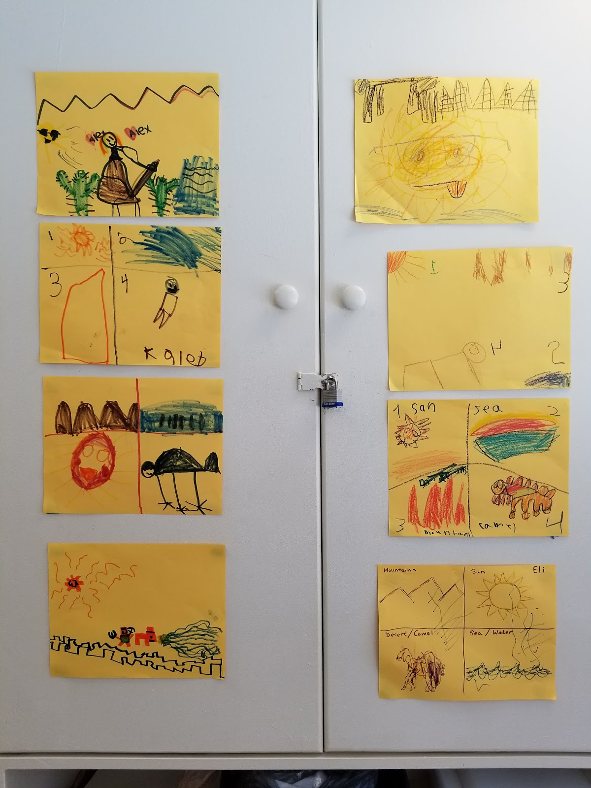 Bar has started to teach us about the different geographical areas of Israel. Today we learned about southern Israel which is made up of mostly desert. We acted out several things you might do in southern Israel during a fun game. Below is a picture of the drawings students created to show the different things you might see in the desert areas of Israel. Can you guess what they are?
