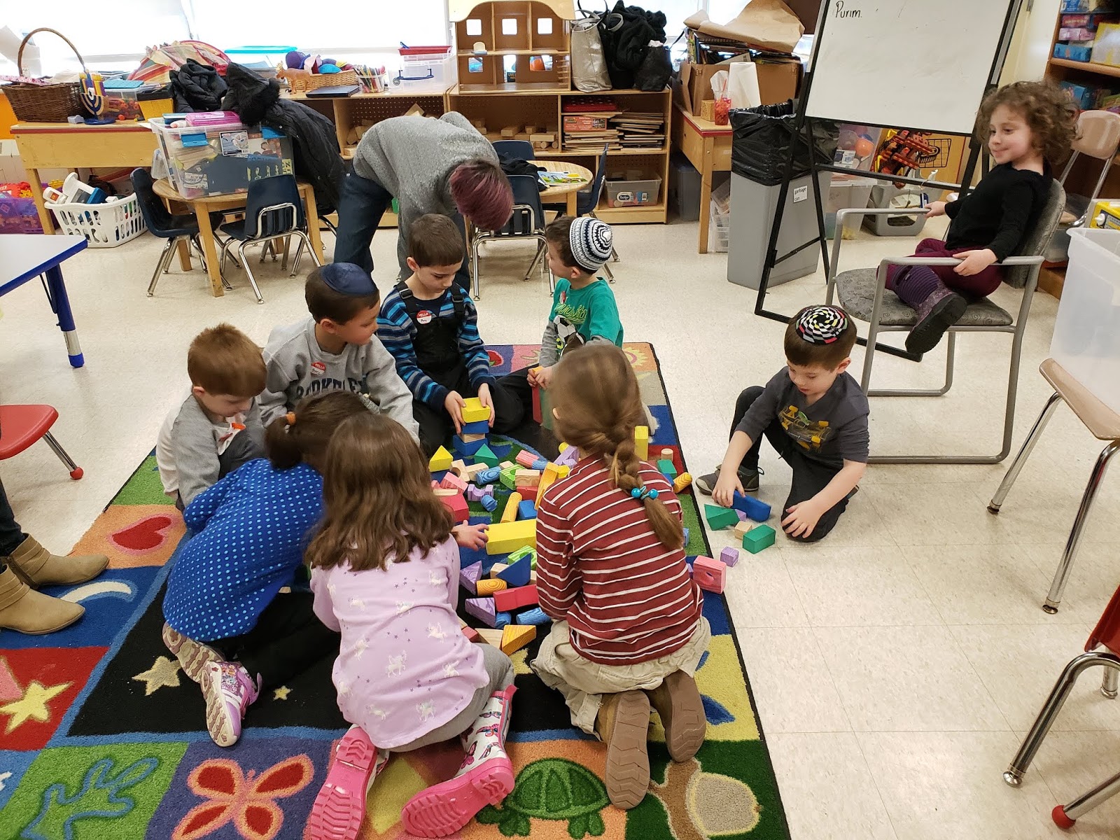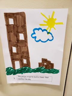 Today we started to learn about Purim by discussing what we already know about Purim and some of us know a lot! We talked about dressing up and special shaped cookies and making lots of noise when you hear Haman’s name. We will use this as a jumping off point to learn new things about the holiday in our upcoming classes. Nitzan came back from Israel last weekend and today she shared with us pictures from her trip. We noticed lots of similarities between the pictures of Nitzan’s time in Israel and things that we have here in our own homes and daily life. There were some differences too. Nitzan and her family live in a building with other apartments for other families to live in. Many of us live in houses with yards. Nitzan’s house has couches and tables and a TV just like we have in our homes. There were lots of pictures of her family and the places she visited including the beach! In our Torah story lessons, we worked on to of our storied. First we illustrated the story of Noah’s Ark. Students could use an example drawing as a model or come up with something original that shared information about the story. Then we practiced creating towers without speaking to our peers just like in the Tower of Babel story. This was hard. First, we were each making our own towers and there weren’t enough blocks for all of the towers to get tall. Then some of us started to work together. We were able to build a taller tower but it was easy for it to fall down. During our reflection, students shared that it was hard to build without talking because you couldn’t ask for help or tell someone else what to do. In a second trial, talking was allowed and the tower was much bigger and was built in much less time.